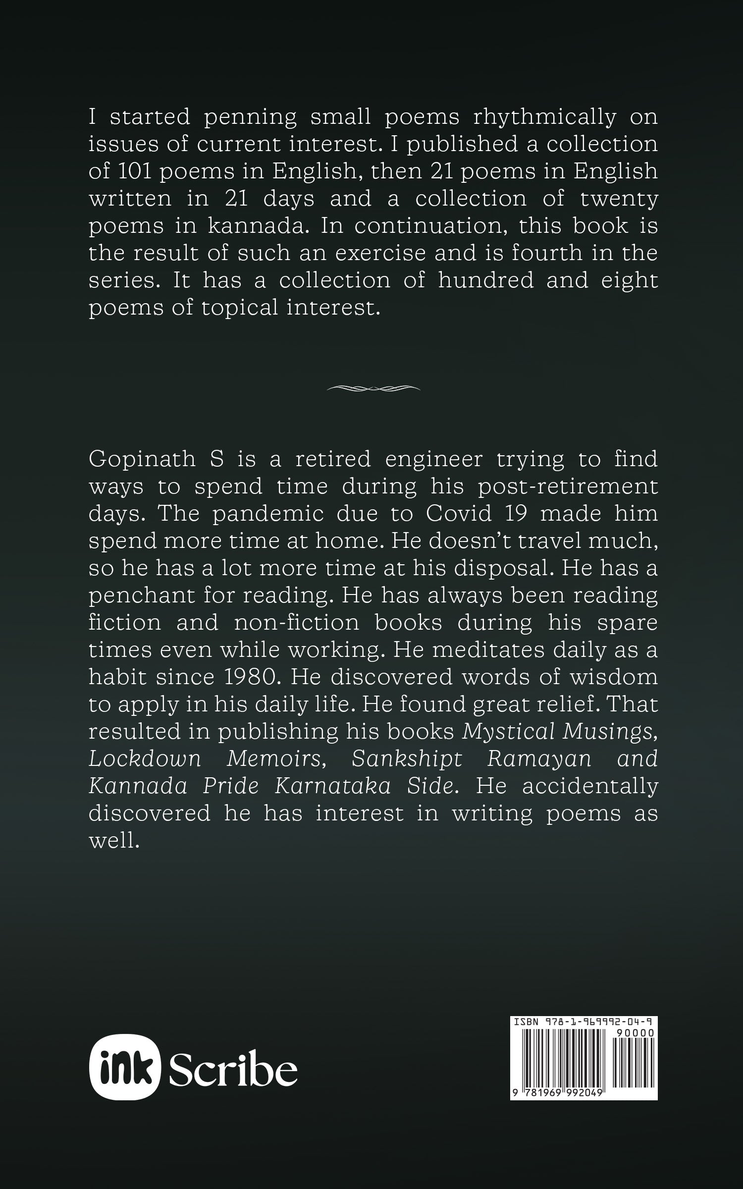 I started penning small poems rhythmically on issues of current interest. I published a collection of 101 poems in English, then 21 poems in English written in 21 days and a collection of twenty poems in kannada. In continuation, this book is the result of such an exercise and is fourth in the series. It has a collection of hundred and eight poems of topical interest.