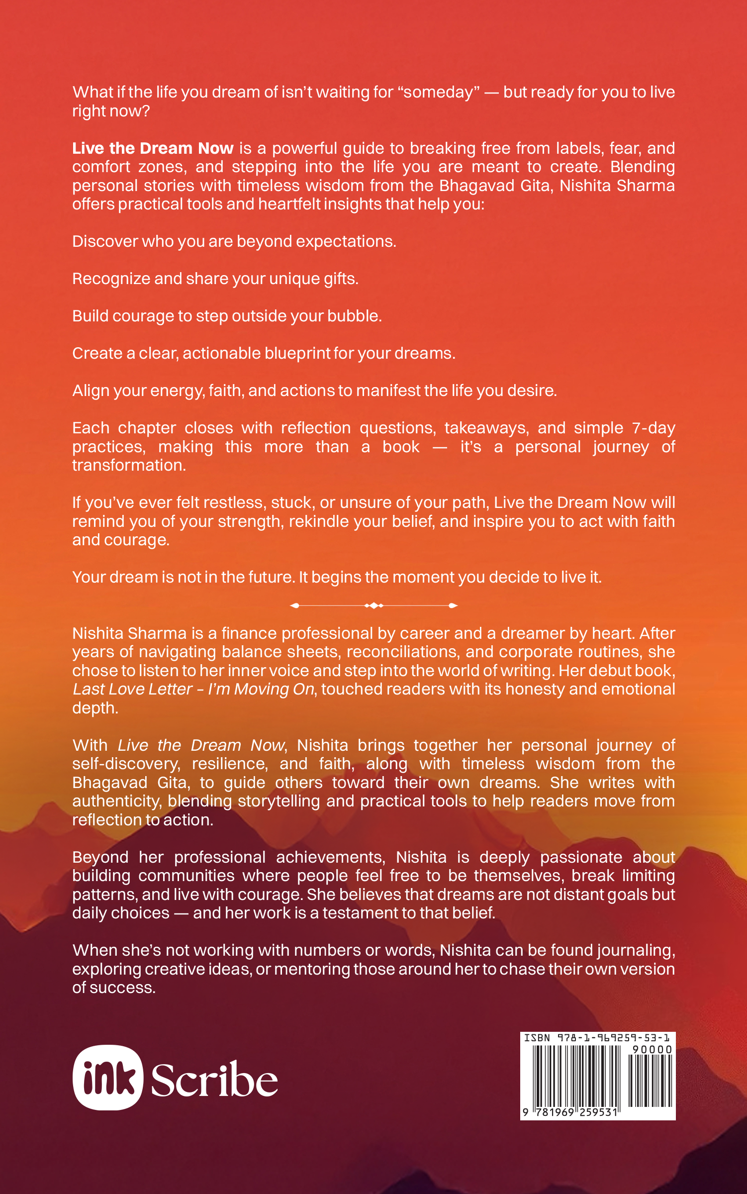Live the Dream Now is a powerful guide to breaking free from labels, fear, and comfort zones, and stepping into the life you are meant to create. Blending personal stories with timeless wisdom from the Bhagavad Gita, Nishita Sharma offers practical tools and heartfelt insights that help you: