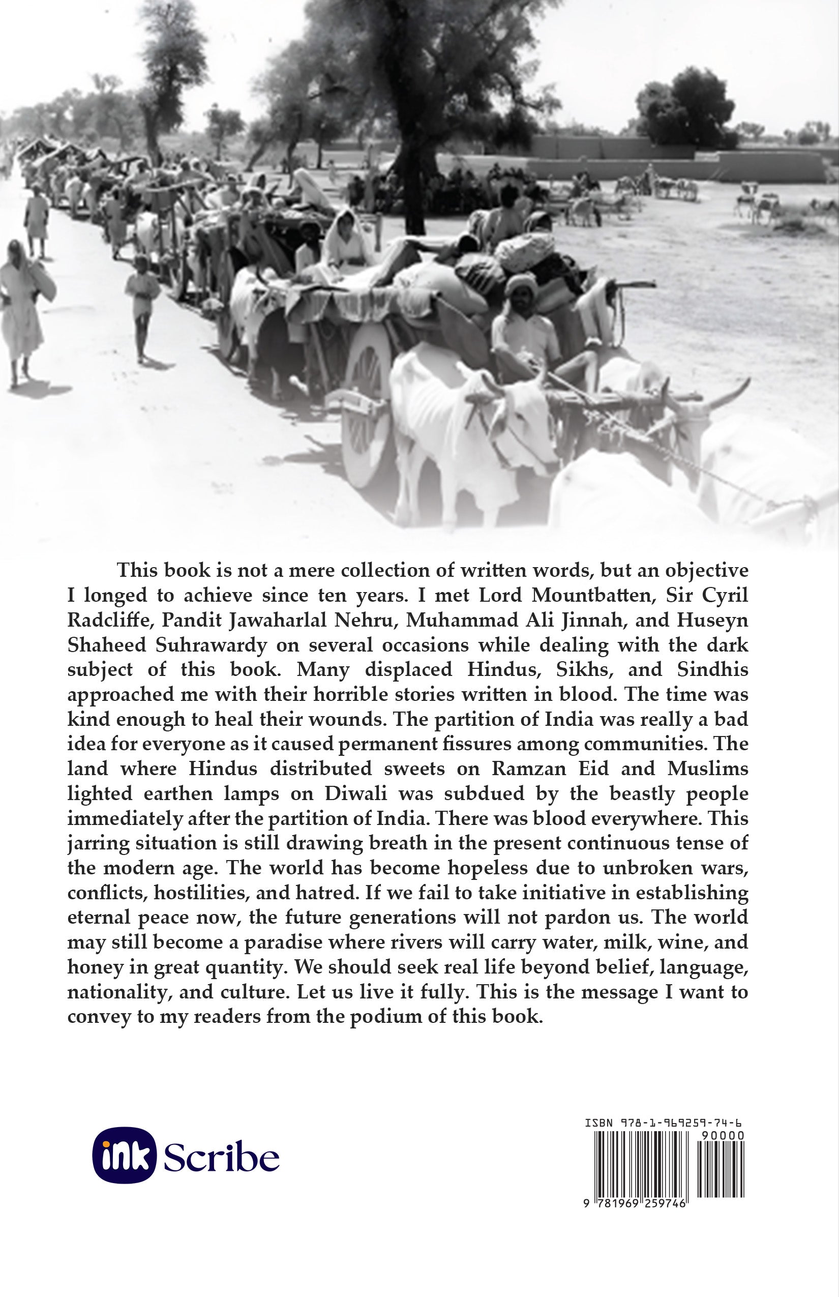 This book is not a mere collection of written words, but an objective I longed to achieve since ten years. I met Lord Mountbatten, Sir Cyril Radcliffe, Pandit Jawaharlal Nehru, Muhammad Ali Jinnah, and Huseyn Shaheed Suhrawardy on several occasions while dealing with the dark subject of this book. Many displaced Hindus, Sikhs, and Sindhis approached me with their horrible stories written in blood. The time was kind enough to heal their wounds. The partition of India was really a bad idea for everyone as it caused permanent fissures among communities. The land where Hindus distributed sweets on Ramzan Eid and Muslims lighted earthen lamps on Diwali was subdued by the beastly people immediately after the partition of India. There was blood everywhere. This jarring situation is still drawing breath in the present continuous tense of the modern age. The world has become hopeless due to unbroken wars, conflicts, hostilities, and hatred. If we fail to take initiative in establishing eternal peace now, the future generations will not pardon us. The world may still become a paradise where rivers will carry water, milk, wine, and honey in great quantity. We should seek real life beyond belief, language, nationality, and culture. Let us live it fully. This is the message I want to convey to my readers from the podium of this book.
