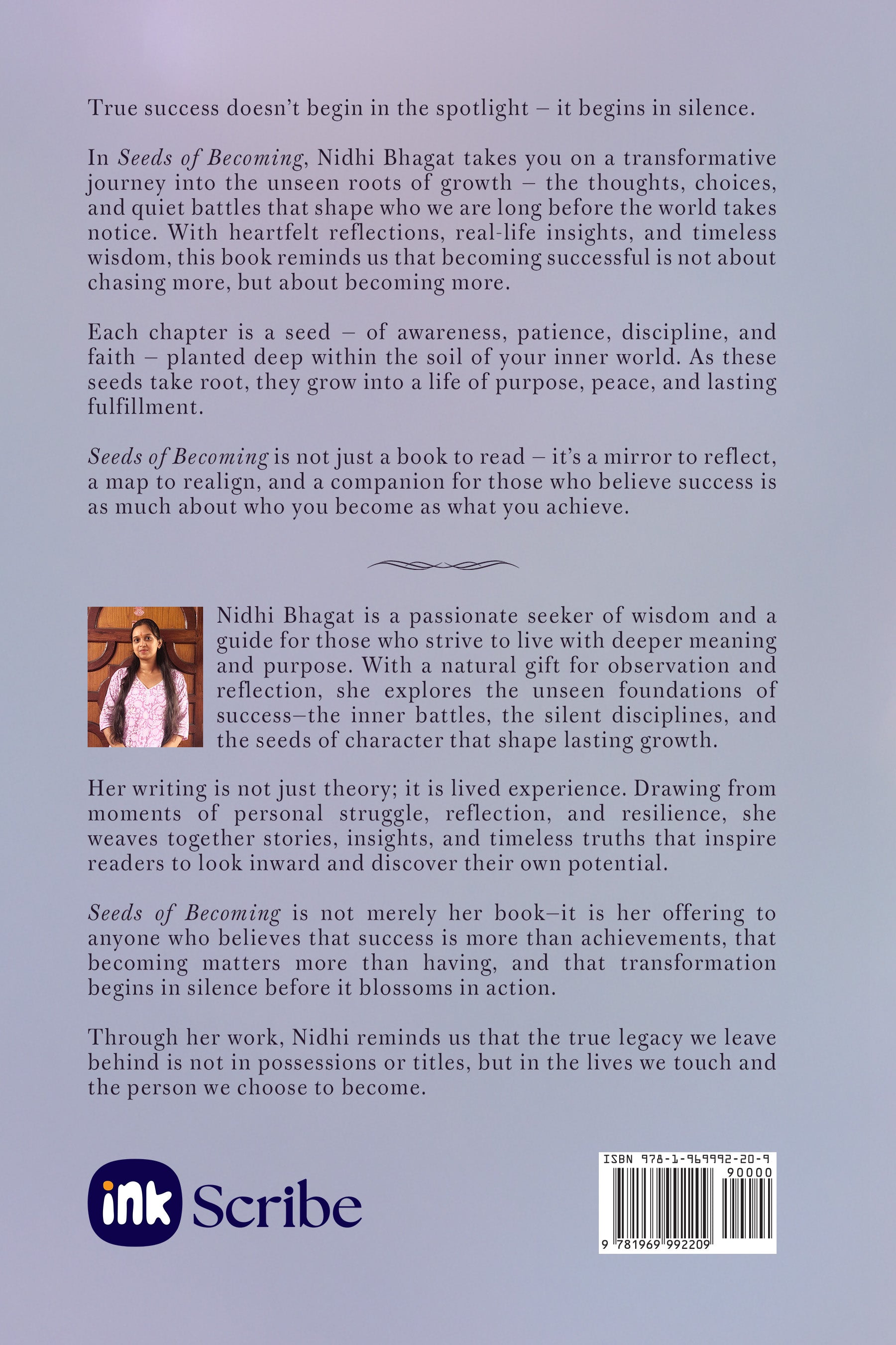 In Seeds of Becoming, Nidhi Bhagat takes you on a transformative journey into the unseen roots of growth — the thoughts, choices, and quiet battles that shape who we are long before the world takes notice. With heartfelt reflections, real-life insights, and timeless wisdom, this book reminds us that becoming successful is not about chasing more, but about becoming more.