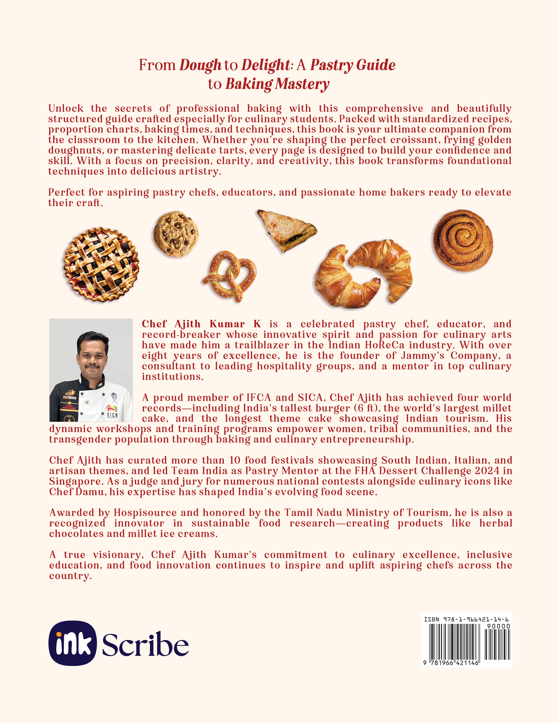 Unlock the secrets of professional baking with this comprehensive and beautifully structured guide crafted especially for culinary students. Packed with standardized recipes, proportion charts, baking times, and techniques, this book is your ultimate companion from the classroom to the kitchen. Whether you're shaping the perfect croissant, frying golden doughnuts, or mastering delicate tarts, every page is designed to build your confidence and skill. With a focus on precision, clarity, and creativity, this book transforms foundational techniques into delicious artistry.