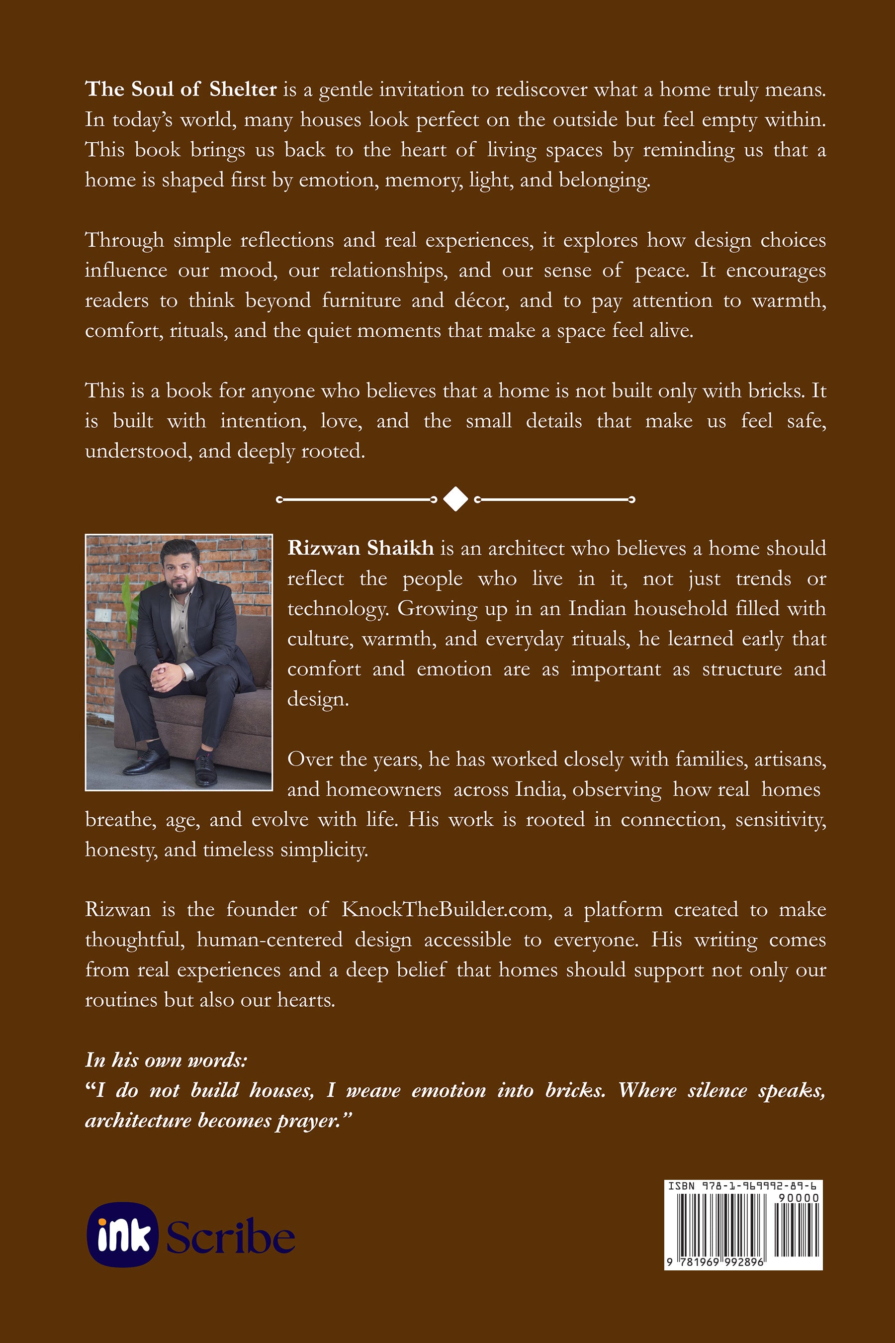 The Soul of Shelter is a gentle invitation to rediscover what a home truly means. In today’s world, many houses look perfect on the outside but feel empty within. This book brings us back to the heart of living spaces by reminding us that a home is shaped first by emotion, memory, light, and belonging.