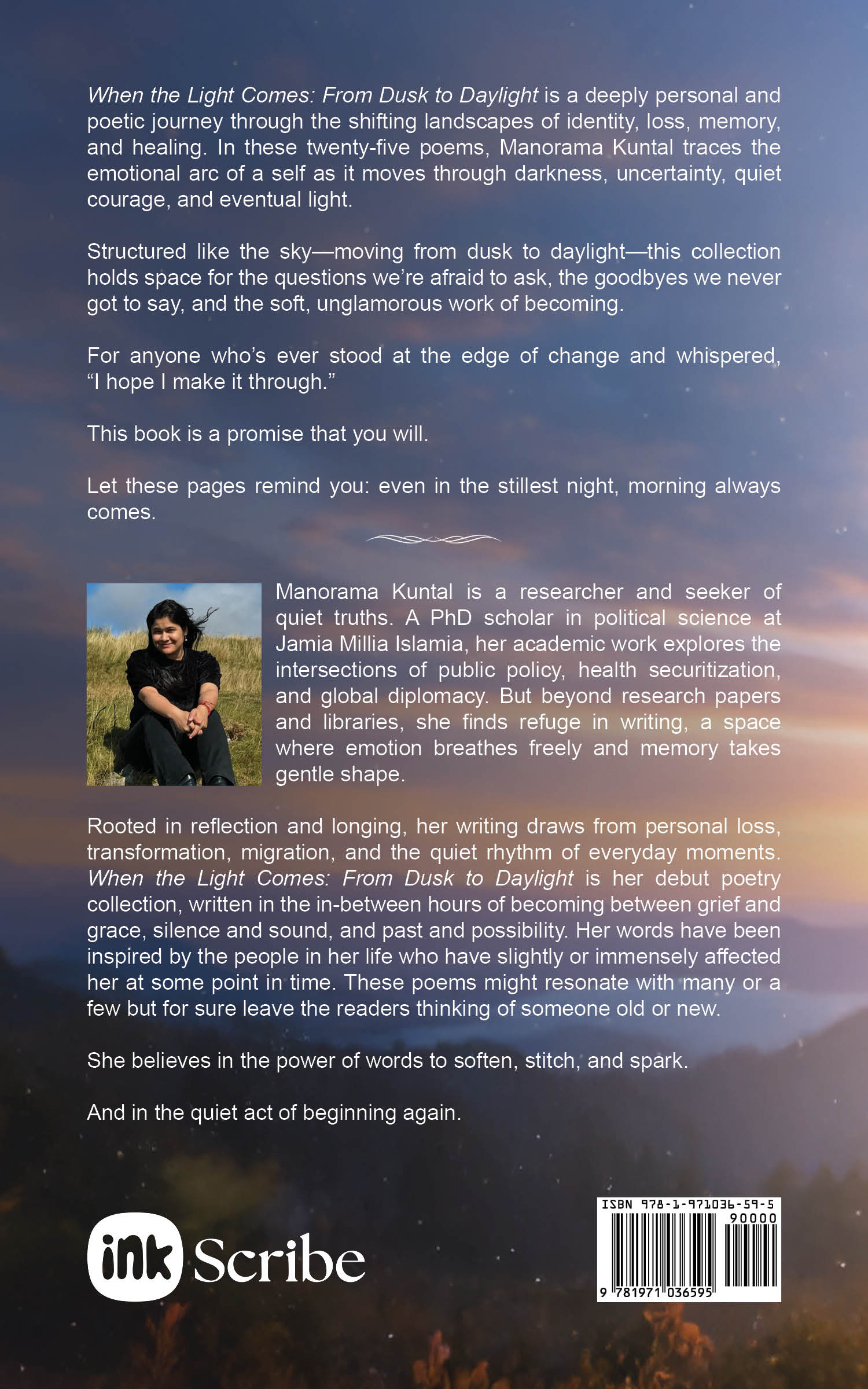 When the Light Comes: From Dusk to Daylight is a deeply personal and poetic journey through the shifting landscapes of identity, loss, memory, and healing. In these twenty-five poems, Manorama Kuntal traces the emotional arc of a self as it moves through darkness, uncertainty, quiet courage, and eventual light.