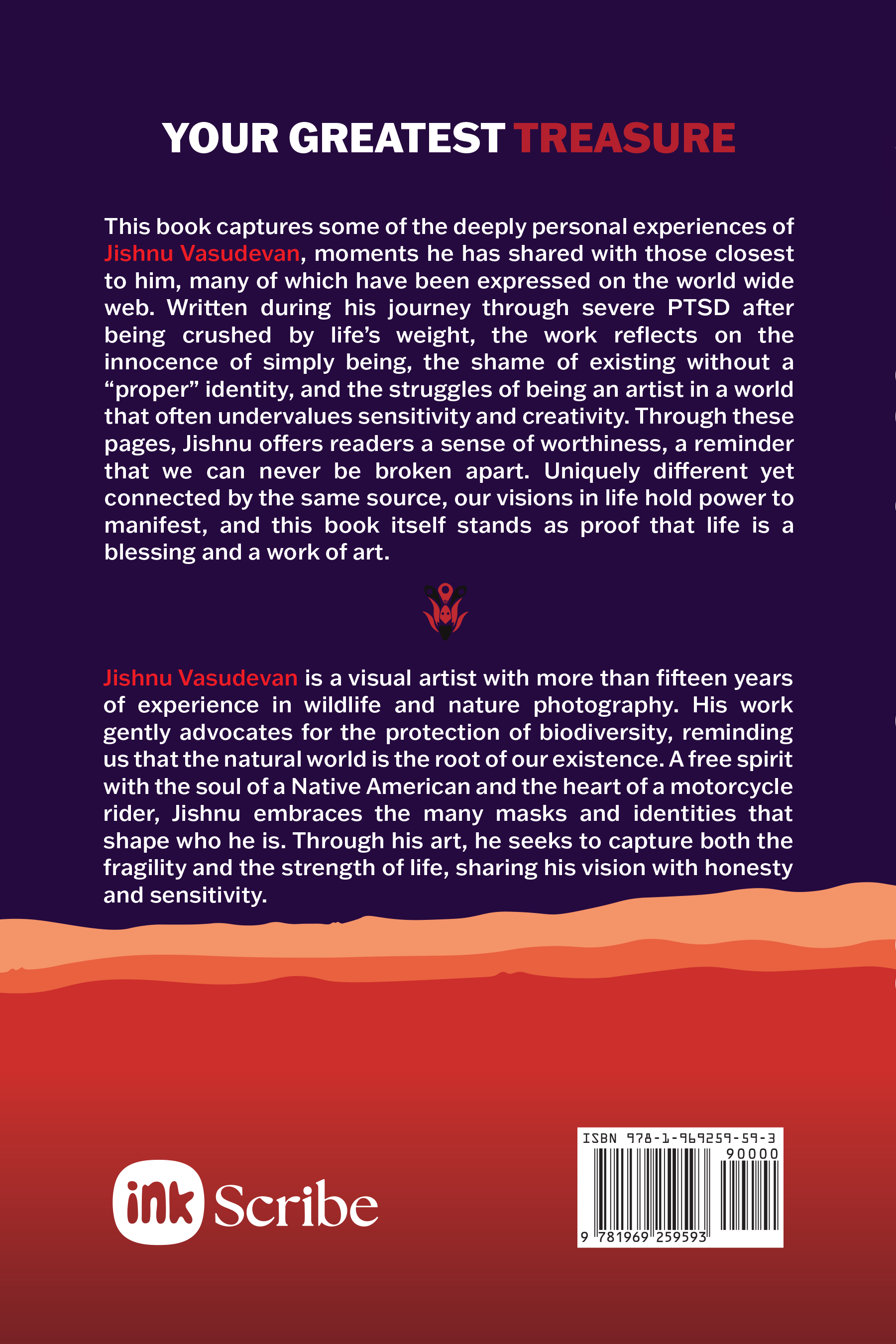 This book captures some of the deeply personal experiences of Jishnu Vasudevan, moments he has shared with those closest to him, many of which have been expressed on the world wide web. Written during his journey through severe PTSD after being crushed by life’s weight, the work reflects on the innocence of simply being, the shame of existing without a “proper” identity, and the struggles of being an artist in a world that often undervalues sensitivity and creativity. Through these pages, Jishnu offers readers a sense of worthiness, a reminder that we can never be broken apart. Uniquely different yet connected by the same source, our visions in life hold power to manifest, and this book itself stands as proof that life is a blessing and a work of art.